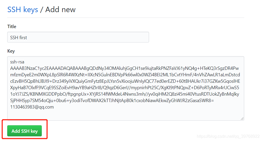 其中Title中的名称可以任意填写,将C:\Users\Administrator\.ssh目录下id_rsa.pub【用记事本打开】复制的所有内容粘贴到Key中,点击Add SSH Key,SSH密钥完成