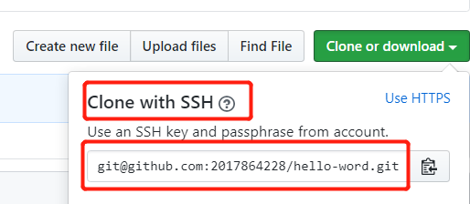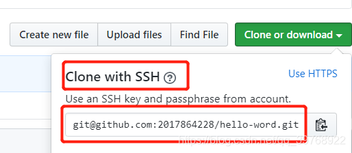 首先,在github中创建一个仓库,如hello-world,选择clone with SSH(之前已经建立好连接)。