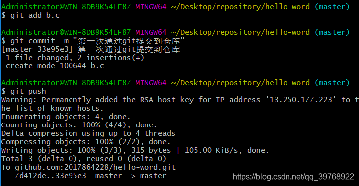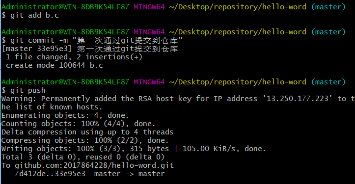 如,此时我在hello-world库中添加了b.c文件,我要将它提交到远程仓库上。