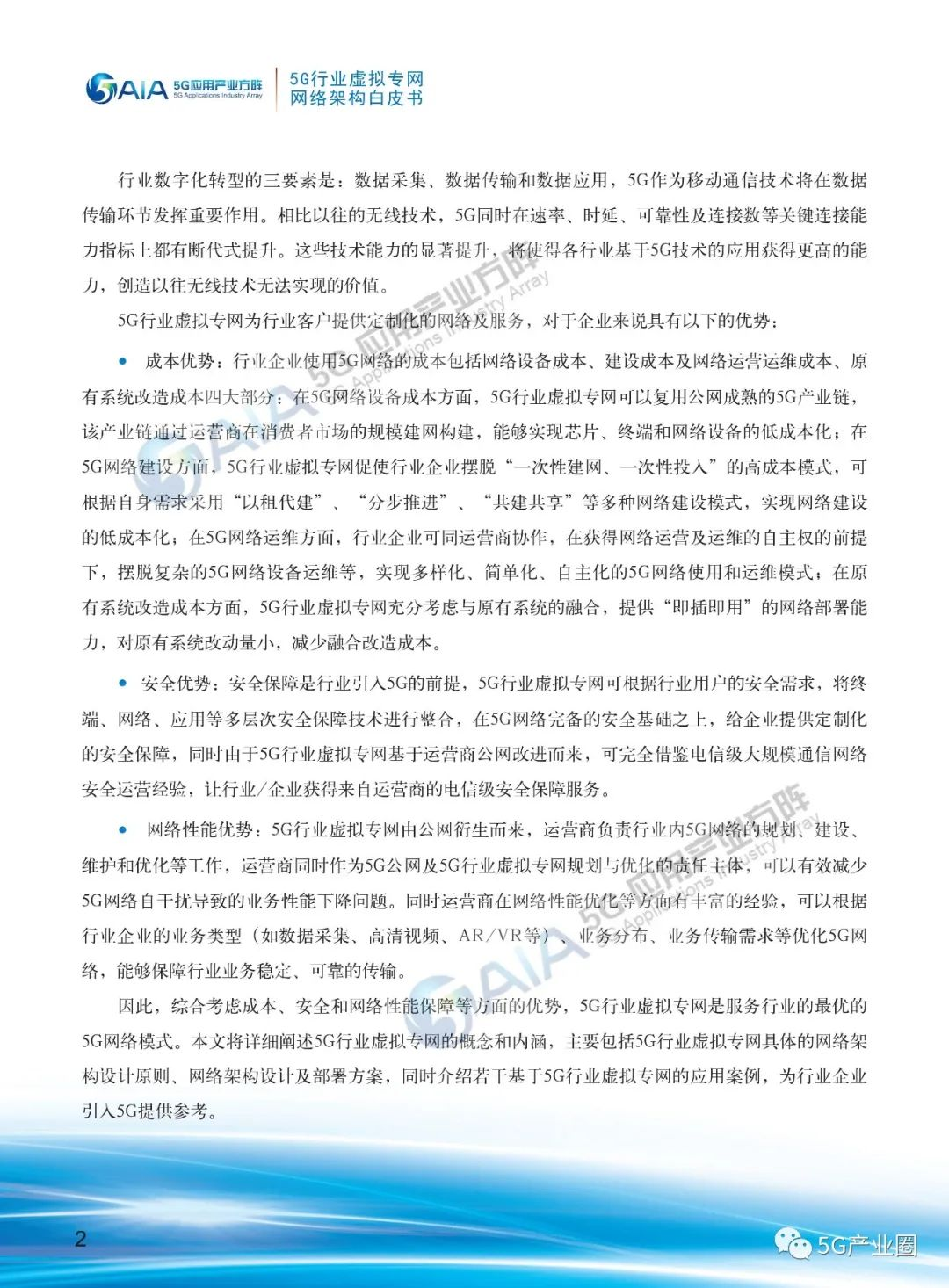 白皮书主要包含三个方面内容:一是提出了行业5G网络架构的设计思路,依靠设计原则定义了5G行业虚拟专网;二是制定了5G行业虚拟专网的整体网络架构及部署方案,为不同规模、不同需求的行业企业提供了部署5G行业虚拟专网的实施方案;三是展示了7大5G行业虚拟专网的融合创新案例,从实际出发阐述了利用5G行业虚拟专网促进企业“提质增效”的实际应用效果。