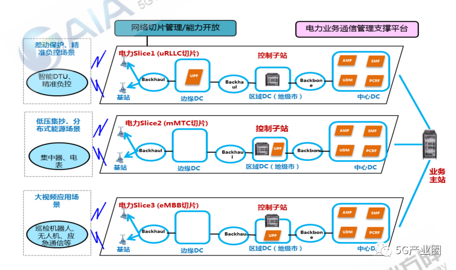案例实现的网络架构如下图所示。该案例规划三大类切片承载不同类型的电网业务,为所属各单 位提供差异化的电力业务网络切片服务:eMBB切片满足高带宽业务需求,承载智能电网的大视频应 用,包括了变电站巡检机器人、应急现场综合自组网应用;uRLLC切片满足低时延业务需求,承载智 能分布式配电自动化业务;mMTC切片满足大连接业务需求,主要承载采集类业务,包括配网计量等。