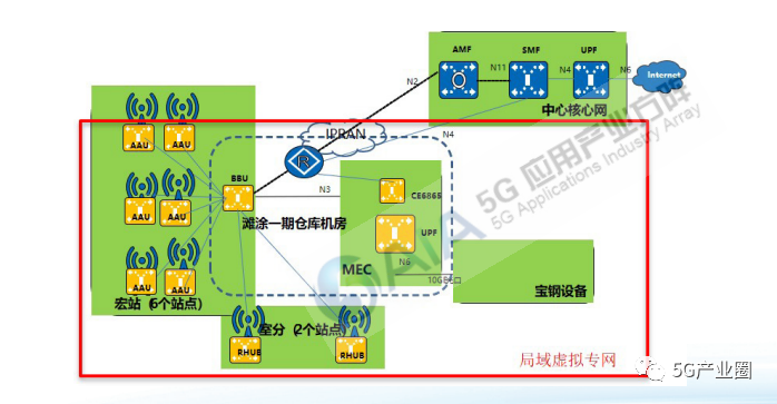 中国电信联合上海宝钢在钢铁制造行业实现了基于5G虚拟专网的业务应用,包括在AGV路径、 AGA末端库、滩涂库等指定仓库区域范围内实现在5G条件下的AGV车载高清监控视频实时查看。监控端包括PC、智能终端、大屏幕等形式。通过5G实现24小时自动化、无人化的钢卷运输,贯通了以往独 立运行的无人仓库与无人码头,整个环节构成了一个完整闭环,避免人为误操作,实现零交通事故,同时借助5G低时延高带宽的特性,整个厂内物流过程在指挥中心完全透明化、实时化,各部门可以对 计划把握得非常精准,与整个车队的调度完美衔接,有效提升了生产效率。本案例采用SA组网模式构建虚拟专网,全区域新建7个5G站点,其中宏站5个、室分2个,共12个小区。