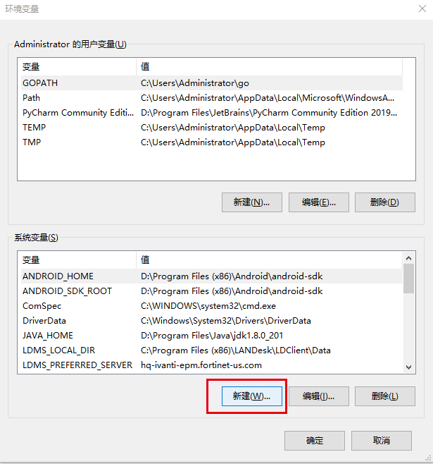 然后在系统属性页面(上图)的右下角选择<环境变量>,进入环境变量页面,如下图