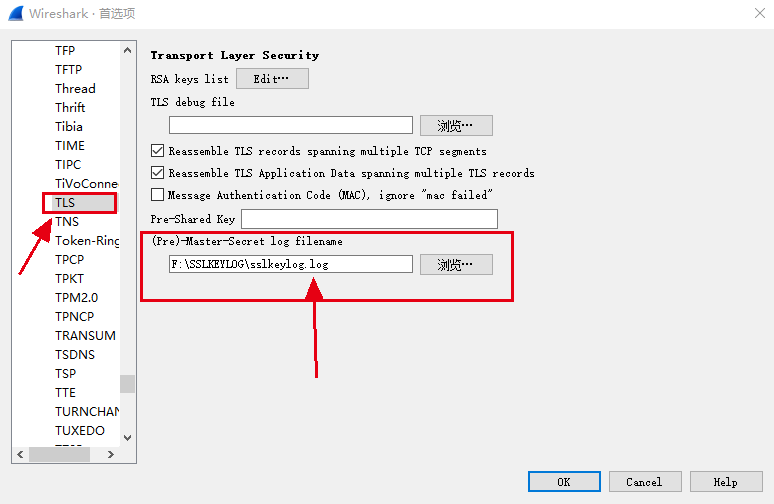 如下图,将key文件的路径填入(Pre)-Master-Secret log filename 中,然后保存