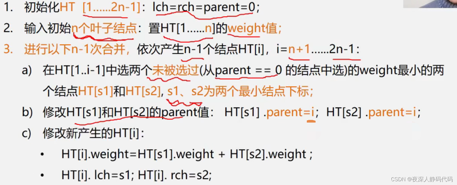 Select(HT, i-1, s1, s2); //在HT[k](1≤k≤i-1)中选择两个其双亲域为0,