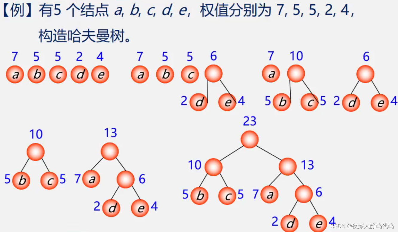 ③经过n-1次合并产生n-1个新结点,且这n-1个新结点都是具有两个孩子的分支结点。
