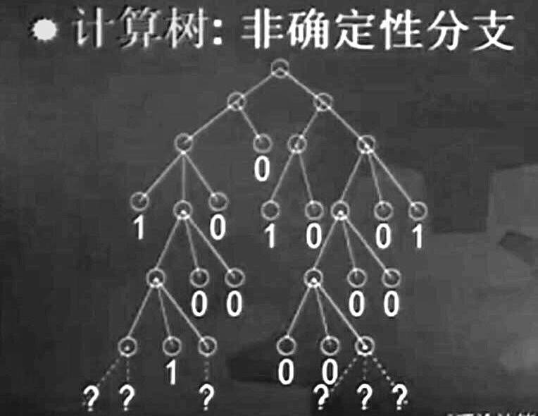 1:停机接受,2:停机拒绝,?:可能永不停机(不确定) 这里:每个结点表示一个格局,每个树枝表示当前格局可以转换下一格局的不同可能。