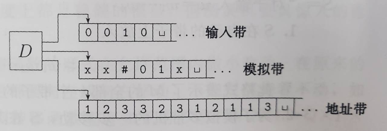 输入带:单独作为一条带是因为每次模拟一个分支都需要读输入字符串。 模拟带:用于模拟NTM的一个计算分支,存放N的带子中的内容。 地址带:又叫路径带,告诉当前结点要选择的子结点,相当于确定分支(如:地址231,根节点出发寻找第二个子结点,再走第三个子结点,最后选择第一个子结点。)