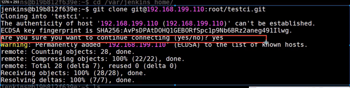 使用ssh无密码连接时,第一次连接需要手动确认。后续就可以以信任的方式拉去内容了。