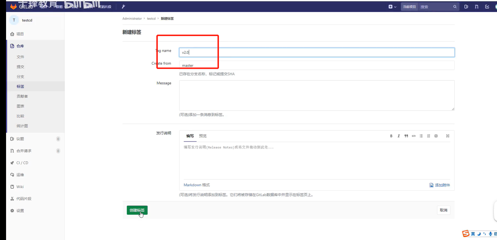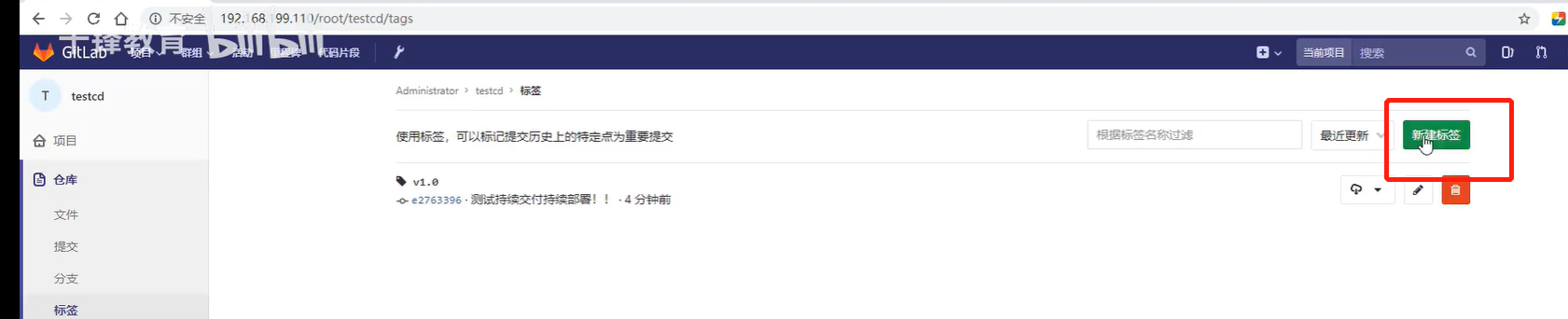在gitlib中找到项目 给项目打标签 ,点击标签 给当前的版本打标签