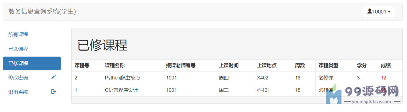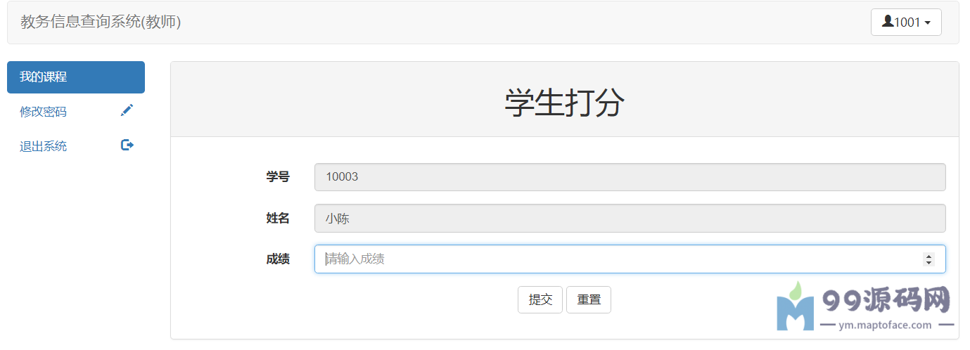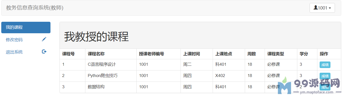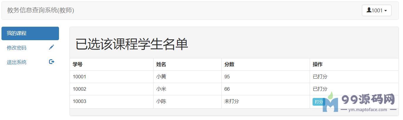 教师:可以查看自己教授的课程,查询选修该课程的学生,对选修该课程的学生进行打分,修改个人密码
