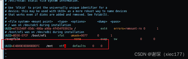 其中第一列为UUID, 第二列为挂载目录(该目录必须为空目录),第三列为文件系统类型,第四列为参数,第五列0表示不备份,最后一列必须为2或0(除非引导分区为1)。