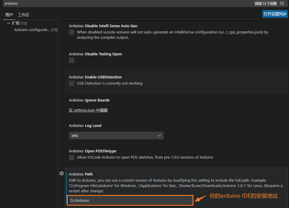 "arduino.path": "D:/Arduino", //注意,这里填入你自己Arduino安装路径,也就是前面配置的Path路径