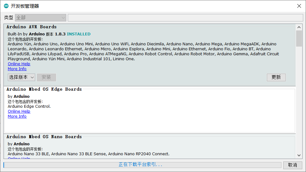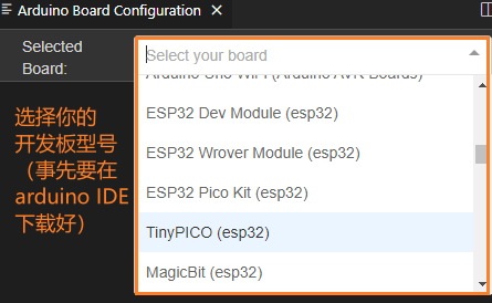 选择开发版(注意:开发板要事先在arduino IDE上下载好才行!详见前面arduino IDE下载开发板部分)