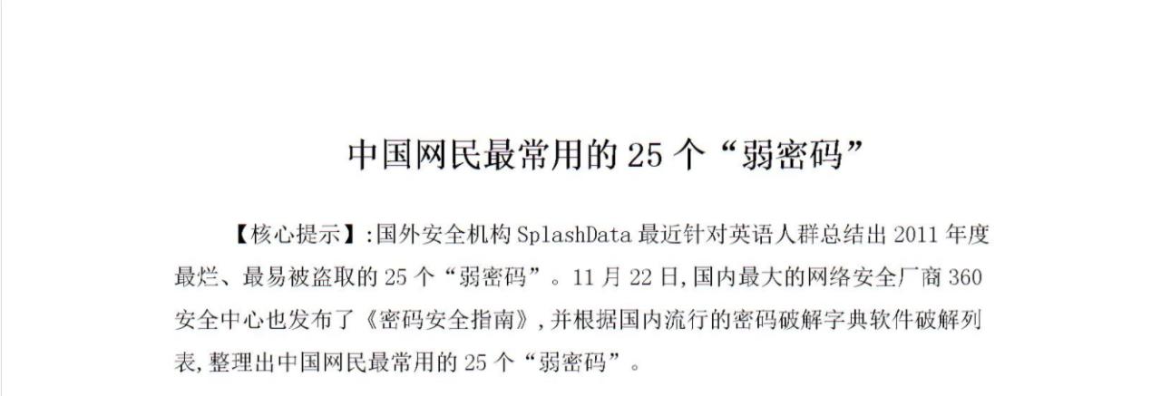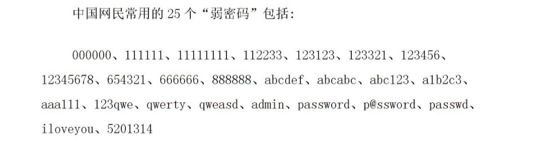在维基百科中由splashdata发布的2011年. 2017年最常见的25个弱密码,这些密码都是非常容易被猜测的,主要的原因是其没有遵循一定的复杂度原则。