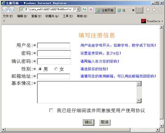<input type="radio" name="agreement" /><span>我已经仔细阅读并同意用户使用协议</span><br/>