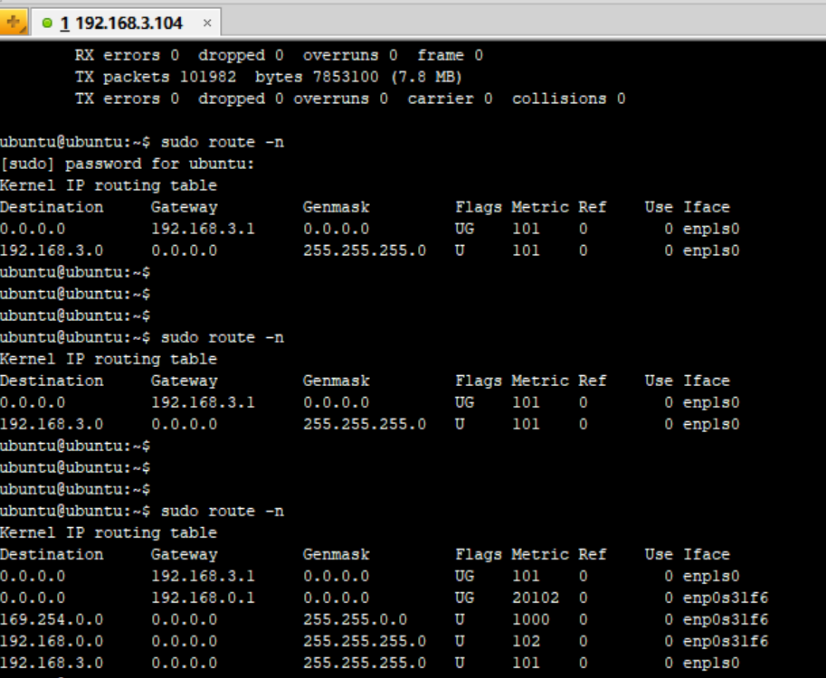 看上图中,一开始只接了外网,0.0.0.0 只指向了网卡enp1s0出口和192.168.3.1网关。 但是接上另外一个网口以后,路由变了,0.0.0.0 都指向了两个不同的网卡出口和网关,这就是问题的原因。修改配置文件是把每个网口的配置网关去掉。