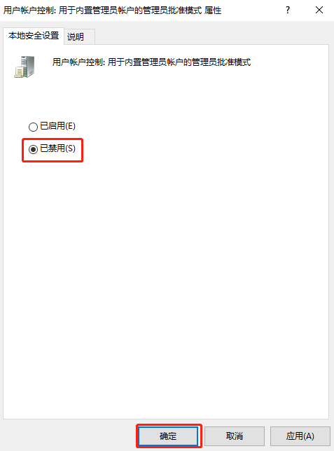 4、设置“用户帐户控制:用于内置管理员帐户的管理员批准模式”为禁用,点击“确定”