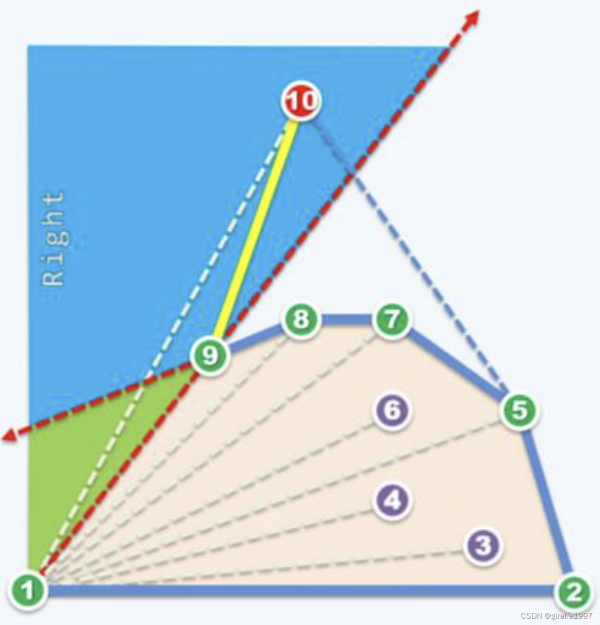 最后位于S栈中的所有顶点就是凸包极点。该算法几乎遍历了所有的顶点,加上每次都进行to-left-test然后出栈入栈(这一步称为scan),如上图所示,当10号点出栈时,点7,8,9与10的连线因为不位于上一个极边划分的空间的左边,需要回退3步,极端情况下,若每一个点的加入都要回退数步,该算法的性能则大大减少。