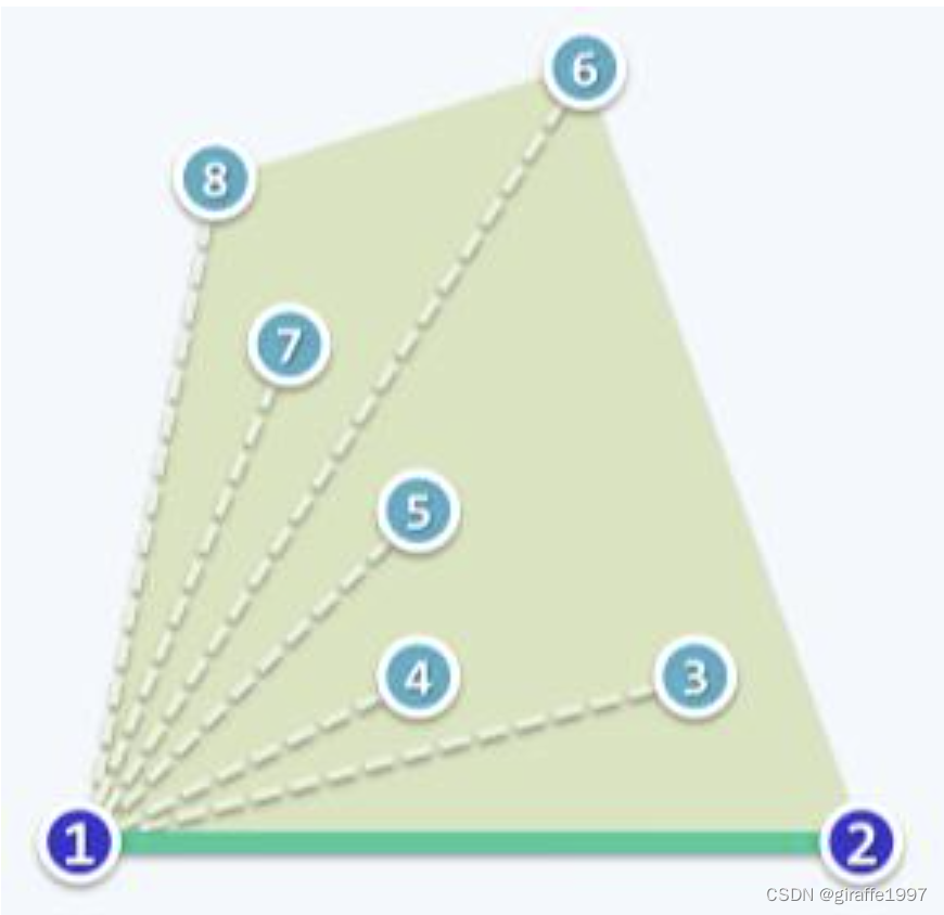 先对多边形进行一个“预处理”,给每个点按序编号,类比有序向量二分查找的思想,来逐步缩小规模。如下图: