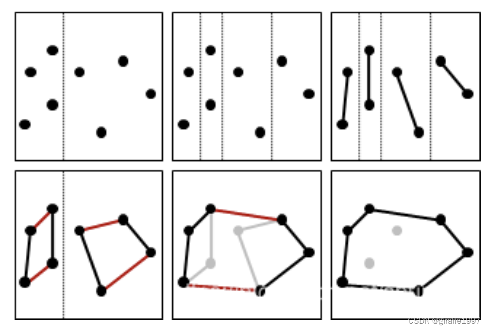 算法沿着某一轴将点集划分为若干组,分别对每一组进行凸包算法(任一算法都可)得出子凸包,然后一一合并凸包