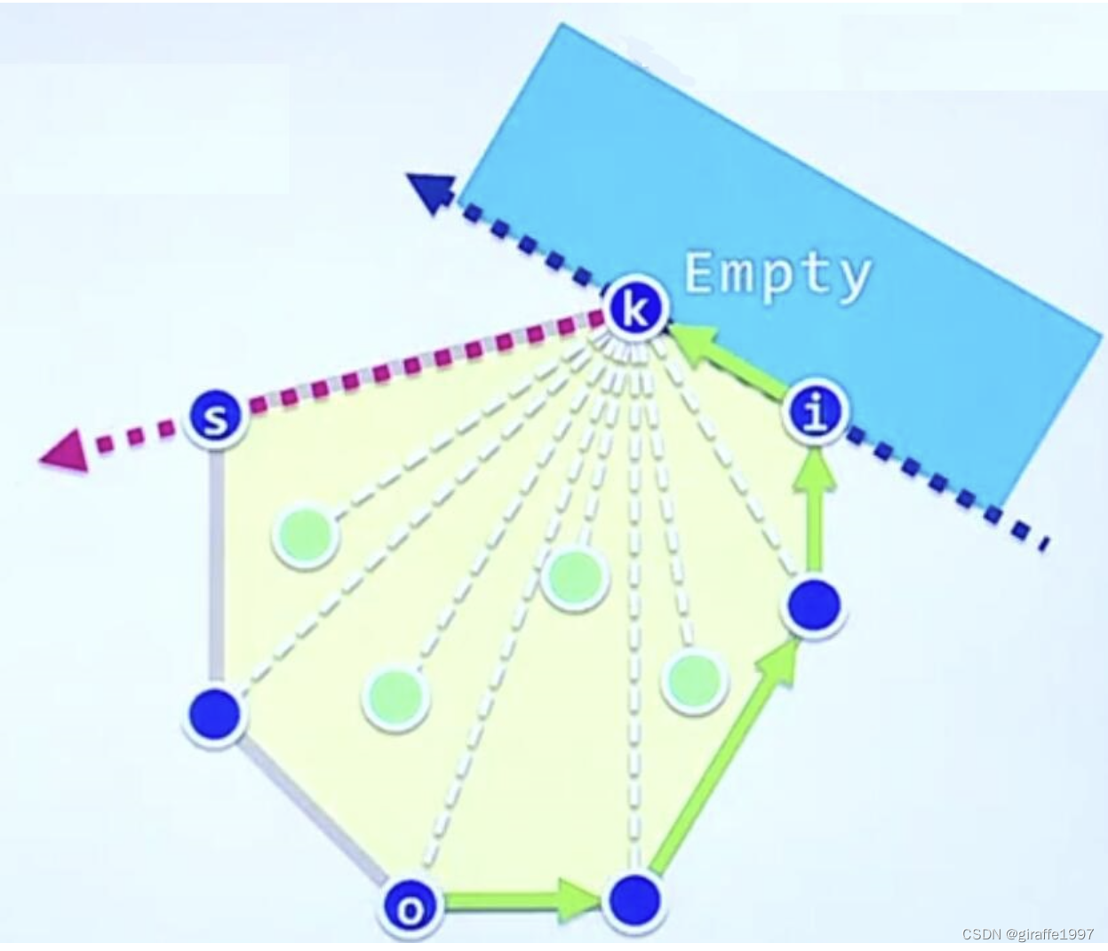 已知i已经是凸包边界节点,从i点到k点做一射线,可用看到所有的点都在极边ik的右侧,则K点是下一个边界节点。继续往下,随机找一个不在边界集合的点,假设为当前最左节点,遍历下一个不在边界集合的点时,和当前节点比较谁在更左侧,若是当前节点则继续往下遍历,否则更新此节点为更左的点,上图相对K最左的点是S,该方法可准确找到凸包极点。
