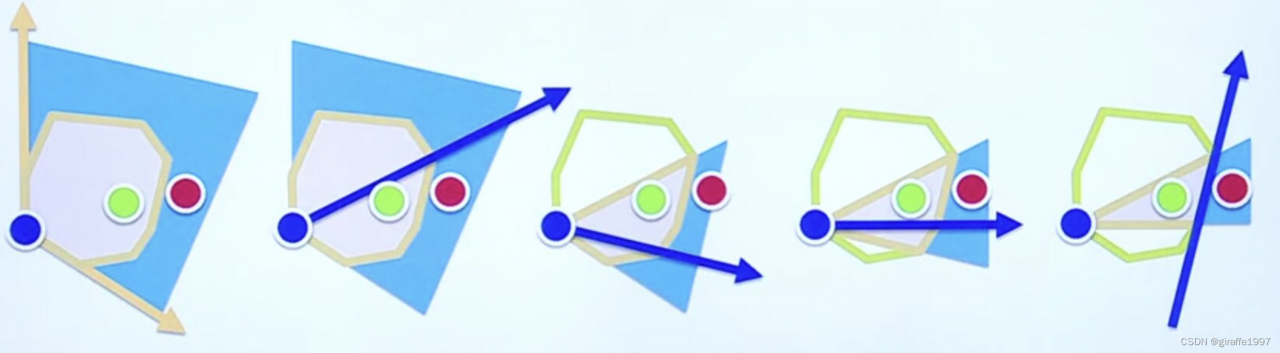就像插入排序一样,每次选一个不在凸包集合内的点加入,判断加入的点是否影响凸包极点(边界点)的size,若加入的点使得size变化或边界集合改变,则调整,如下图6,7,9所示。