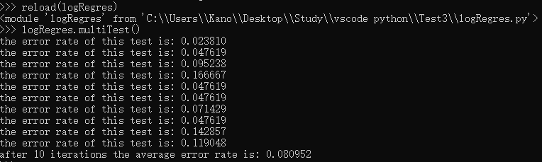 return weights下面这一段第一个函数为classifyVector(),它以回归系数和特征向量作为输入来计算对应的Sigmoid值。如果Sigmoid值大于0.5函数返回1,否则返回0。接下来是函数colicTest()。用于打开测试集和训练集,并对数据进行格式化处理的函数。嘎斯函数首先导入训练集,数据的最后一列为类别标签。数据导入之后,使用函数stocGradAscent1()来计算回归系数向量。最后一个函数为multiTest(),其功能是调用函数colicTest()10次并求结果的平均值。