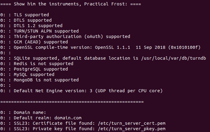 | sudo turnserver -c /usr/local/etc/turnserver.conf -a -f -v -r domain.com |
