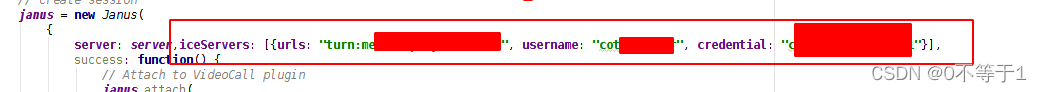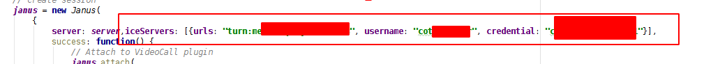 | server: server,iceServers: [{urls: "turn:domain.com.cn:3478改成你自己的域名或ip", username: "user改成你自己的账号", credential: "123456改成你自己的密码"}], |
