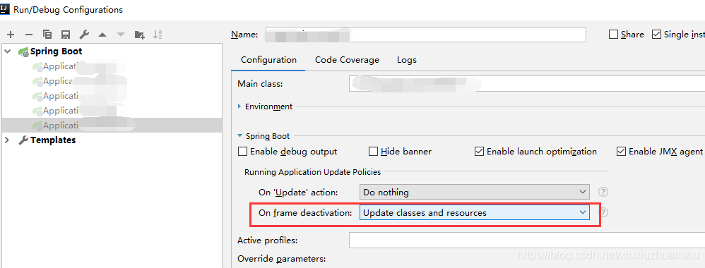 2、修改服务器配置,即当idea失去焦点时更新类和资源,但是这种只支持在debug模式且是在idea失去焦点才会触发热部署,相对加载慢