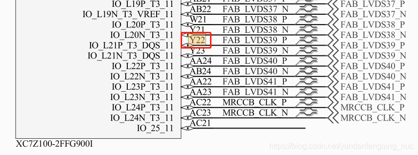 差分引脚输出单端信号时,一般大多使用P引脚。这个时候需要主要,电平标准要配置成对应的单端信号电平标准,比如现在要给差分引脚Y22输出一个单端信号,如下图所示:
