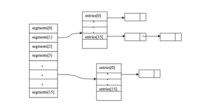 如下图所示,ConcurrentHashMap本质上是一个Segment数组,而一个Segment实例又包含若干个桶,每个桶中都包含一条由若干个 HashEntry 对象链接起来的链表。总的来说,ConcurrentHashMap的高效并发机制是通过以下三方面来保证的(具体细节见后文阐述):