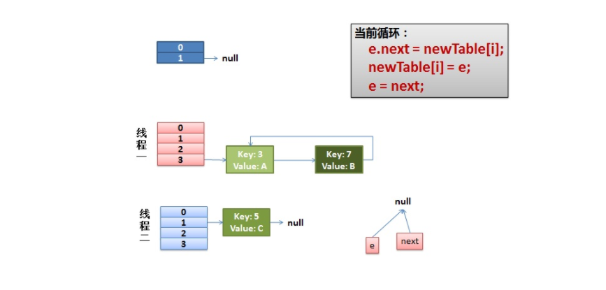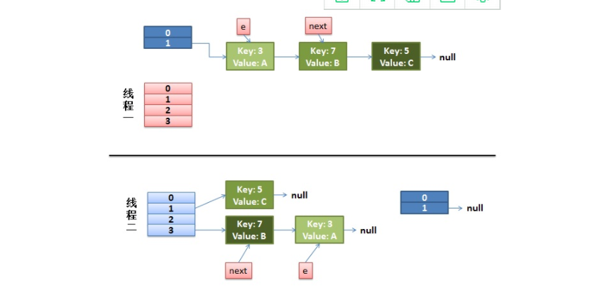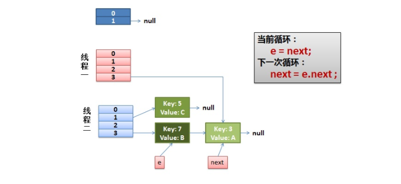 假设我们有两个线程,我用红色和浅蓝色标注了一下,被这两个线程共享的资源正是要被重哈希的原来1号桶中的Entry链。我们再回头看一下我们的transfer代码中的这个细节: