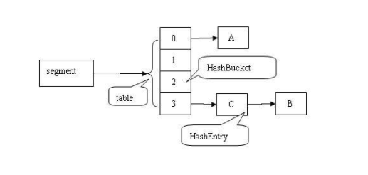 Segment 类继承于 ReentrantLock 类,从而使得 Segment 对象能充当锁的角色。每个 Segment 对象用来守护它的成员对象 table 中包含的若干个桶。table 是一个由 HashEntry 对象组成的链表数组,table 数组的每一个数组成员就是一个桶。