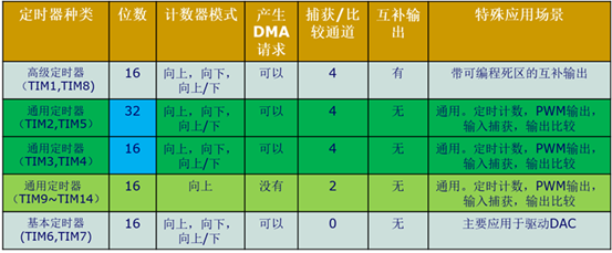 STM32F4 的定时器有14个,其中TIM2~TIM5,TIM9~TIM14属于通用定时器,TIM1 和TIM8 则属于高级控制定时器,TIM6和TIM7是基本定时器。