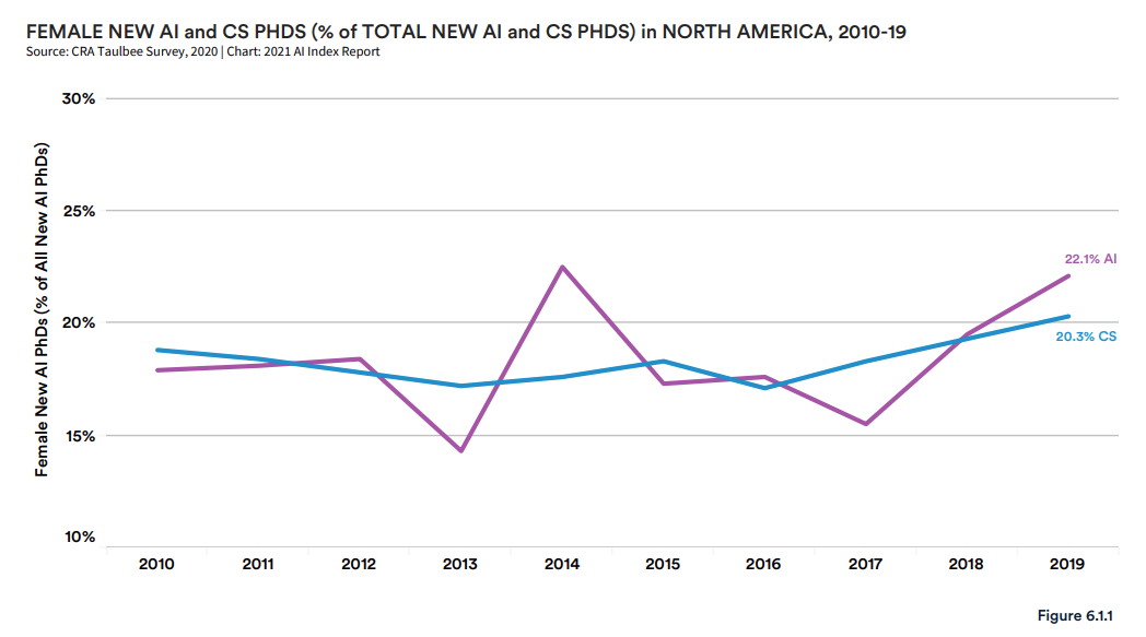 近年来,AI 博士毕业生和计算机科学终身教授的女性成员比例一直很低。根据计算机研究协会 (CRA) 的一项年度调查,北美 AI 博士项目的女性毕业生占所有博士毕业生的平均比例不足 18% 。