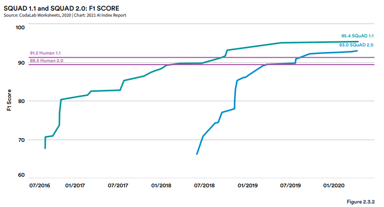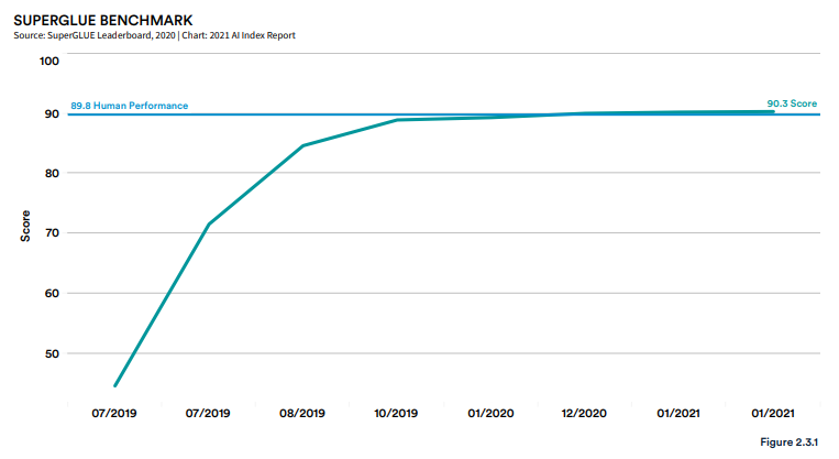 这一点可以从在 SuperGLUE 上获得人类水平性能的系统的快速兴起看出。SuperGLUE 是为响应早期 NLP 进展(超越 GLUE 评估的功能)而开发的 NLP 评估套件。