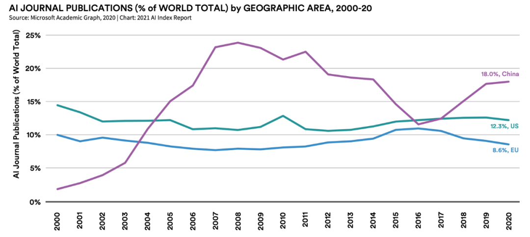 其中,中国的 AI 期刊论文发表数量最多(占比 18.0%),超过美国(12.3%)和欧洲(8.6%)。这对于中国而言并非首次。