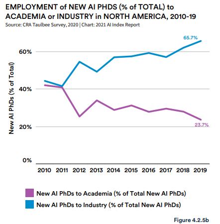 更多 AI 博士选择进入工业界,而不是留在学术界,离开学界进入企业的教授数量也在持续增长;
