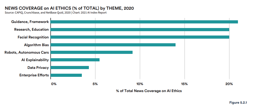 如图 5.2.1 所示,在 2020 年最受关注的新闻话题中,与 AI 道德指导及框架有关的文章名列榜首,随后是研究与教育、人脸识别等。