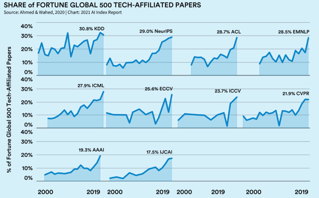 有研究表明,大型科技企业对 AI 顶会的参与度有所增加。研究者认为学术界算力的不均匀分布(即「计算鸿沟」)将加剧深度学习时代的不平等。大型科技企业拥有更多资源来设计 AI 产品,但其多样化程度逊色于较小型的机构,而这引发了对 AI 偏见及公平性的担忧。下图展示了大企业在 10 个 AI 顶会中的参与度,这或许会加速计算鸿沟。