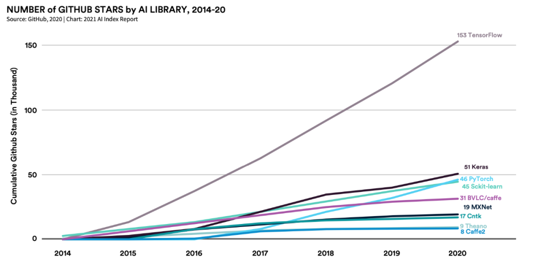 除了论文、会议情况以外,该章节还介绍了 AI 开源软件库。其中谷歌开发的 TensorFlow 框架仍然是最流行的 AI 软件库,其次是 Keras 和 PyTorch。