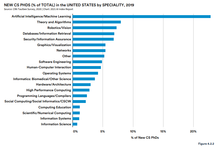 根据 CRA 的调查,在过去 10 年中,美国 AI 相关博士占 CS 博士学位总数的比例从 14.2% 上升到 2019 年的 23% 左右。与此同时,其他以前比较流行的计算机科学博士的受欢迎程度有所下降,包括网络、软件工程和编程语言。与 2010 年相比,编译器专业获得博士学位的人数有所减少,而 AI 和机器人 / 视觉专业的博士人数则大幅增加。