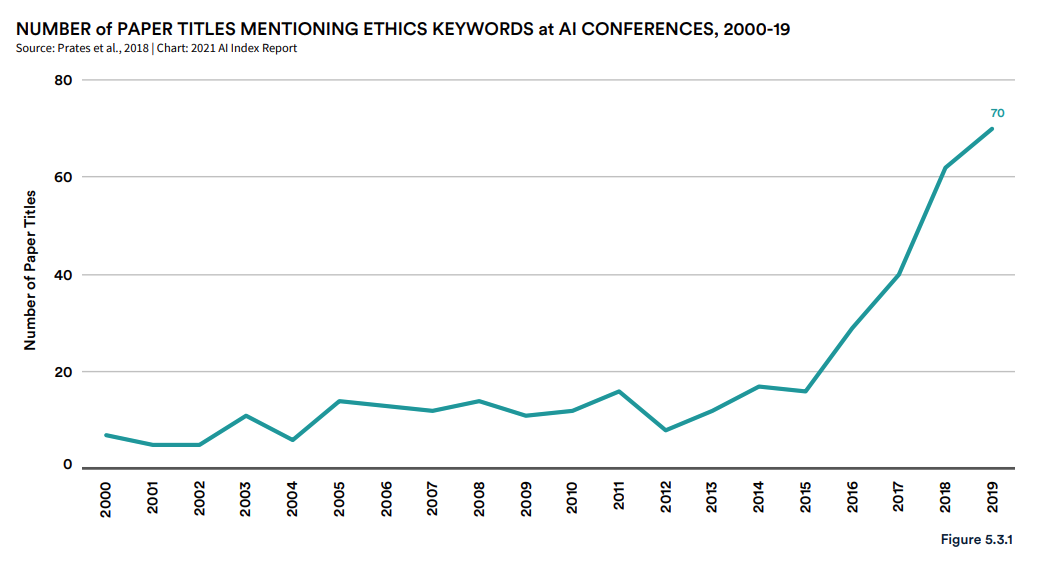 如图 5.3.1 所示,自 2015 年以来,向 AI 会议提交的论文里,标题含有伦理相关关键词的数量大幅增加。