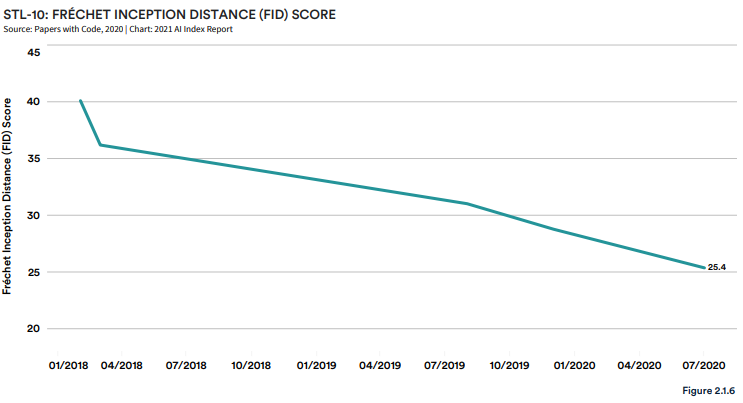 2018-2020 年生成模型在 STL-10 数据集上的 FID 得分。