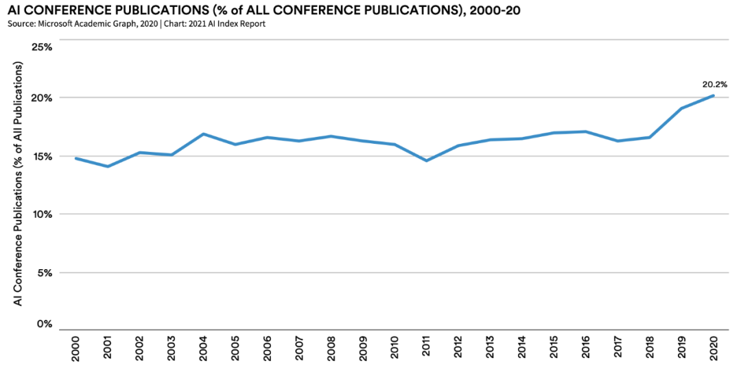 2000-2020 年,AI 会议论文发表数量占所有会议论文的比例。