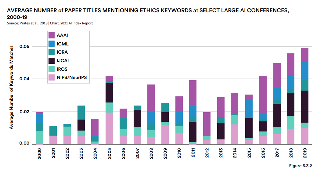 但近年来,在主流 AI 会议中与伦理相关关键词匹配的论文标题的平均数量依然很低。图 5.3.2 展示了六个主流会议所有出版物中伦理相关关键词匹配的平均数量。