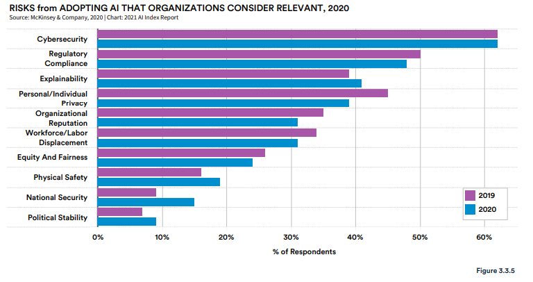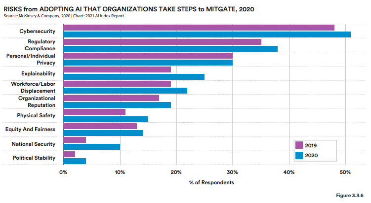 麦肯锡的一项调查显示,尽管越来越多人呼吁解决 AI 使用相关的道德问题,但业界在解决这些问题的努力上非常少。例如,AI 的公平性等问题仍然受到很少公司的关注。此外,与 2019 年相比,2020 年将个人或个人隐私风险视为相关风险的公司较少。