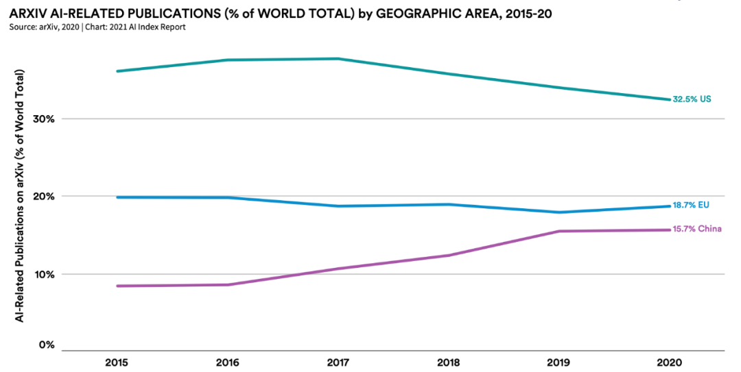 除了传统的期刊和会议以外,预印本平台的论文发表也很重要。过去 6 年中,arXiv 平台上的 AI 相关论文增长了五倍多,从 2015 年的 5478 篇增长到 2020 年的 34,736 篇。其中中国的 arXiv 论文发表总数仍逊色于美国和欧洲,不过从占比情况来看,中国正在奋起直追。